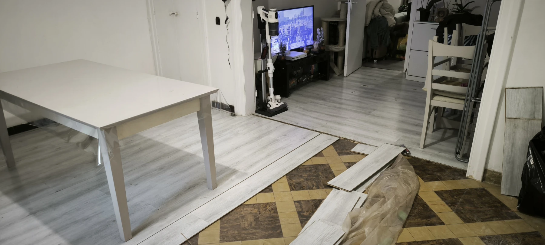Dépose du revêtement de sol stratifié abîmé par humidité, de la sous-couche et des plinthes carrelage.