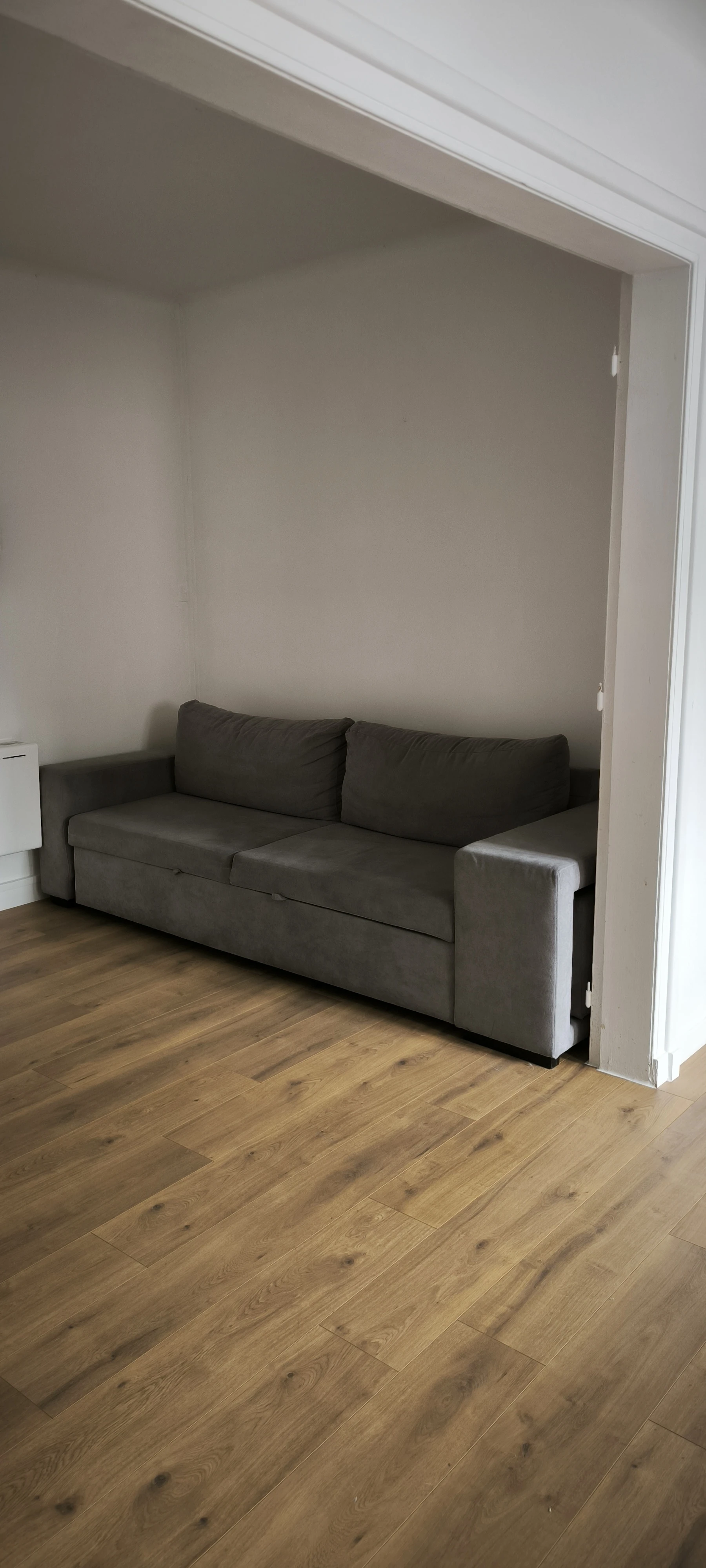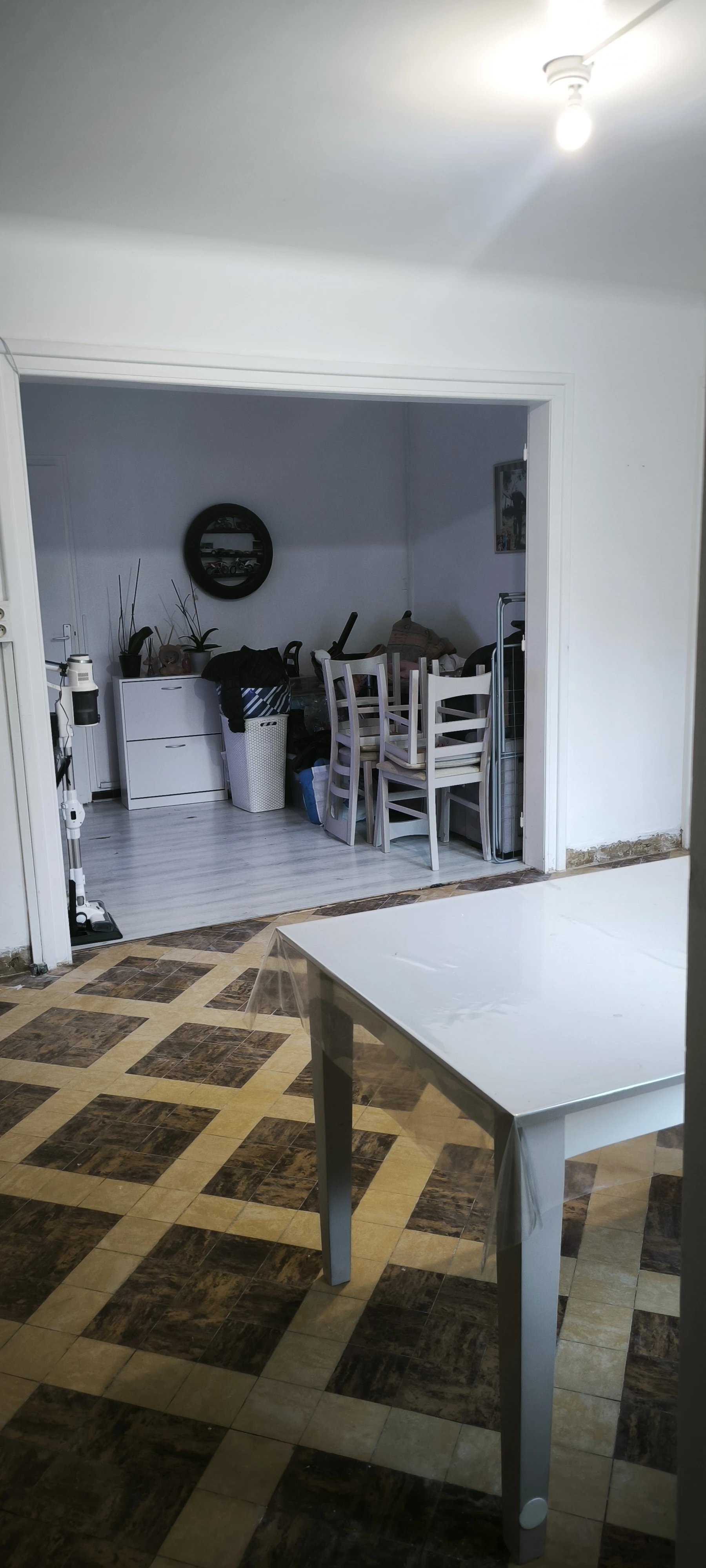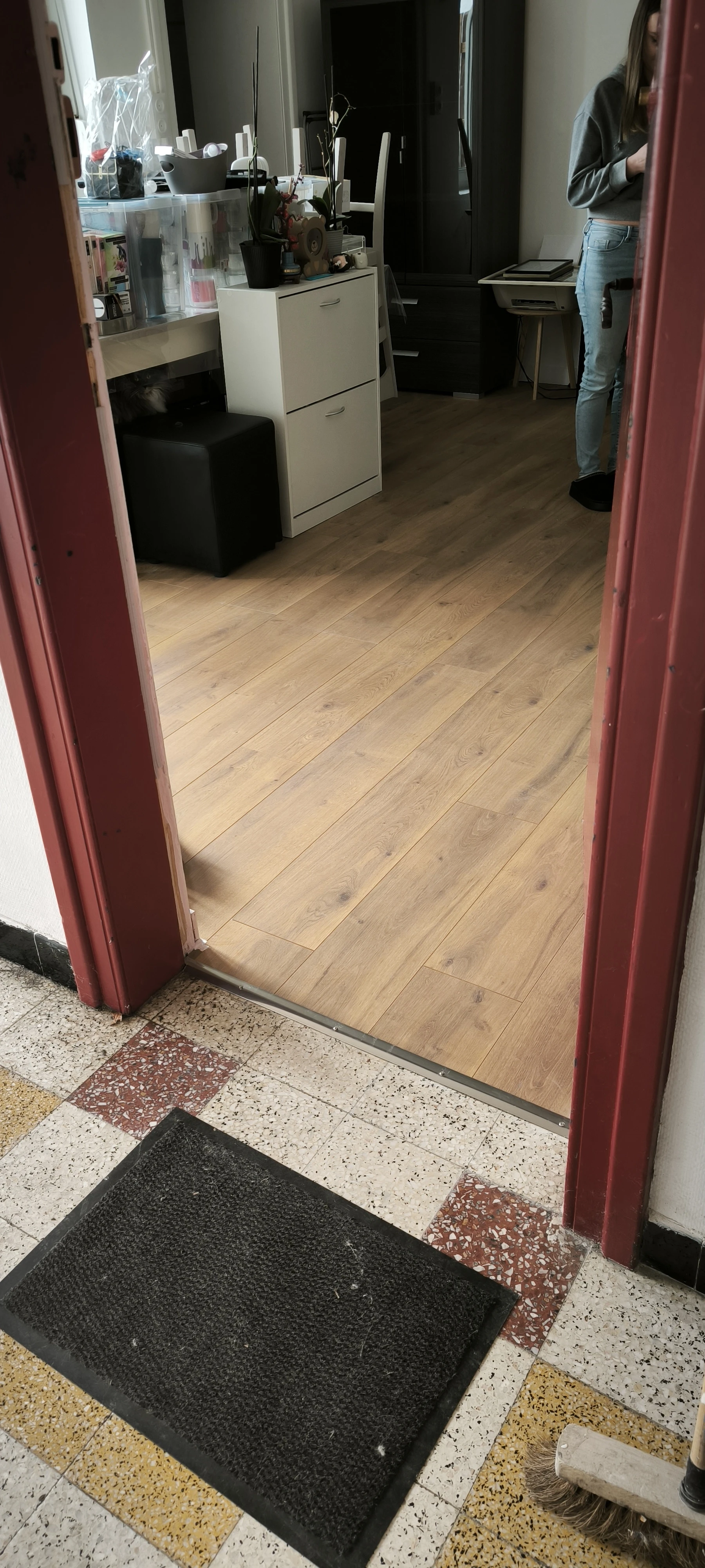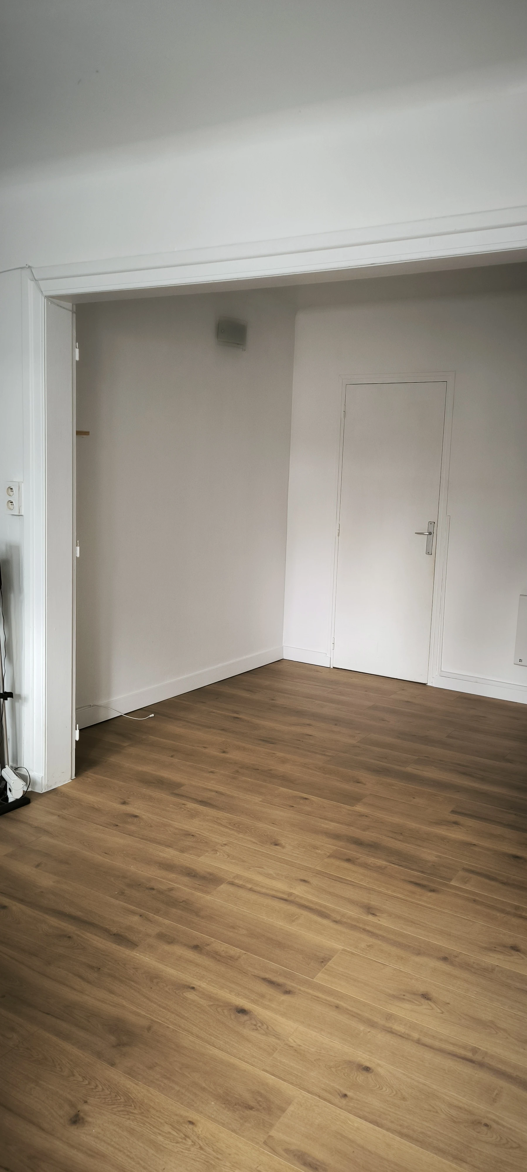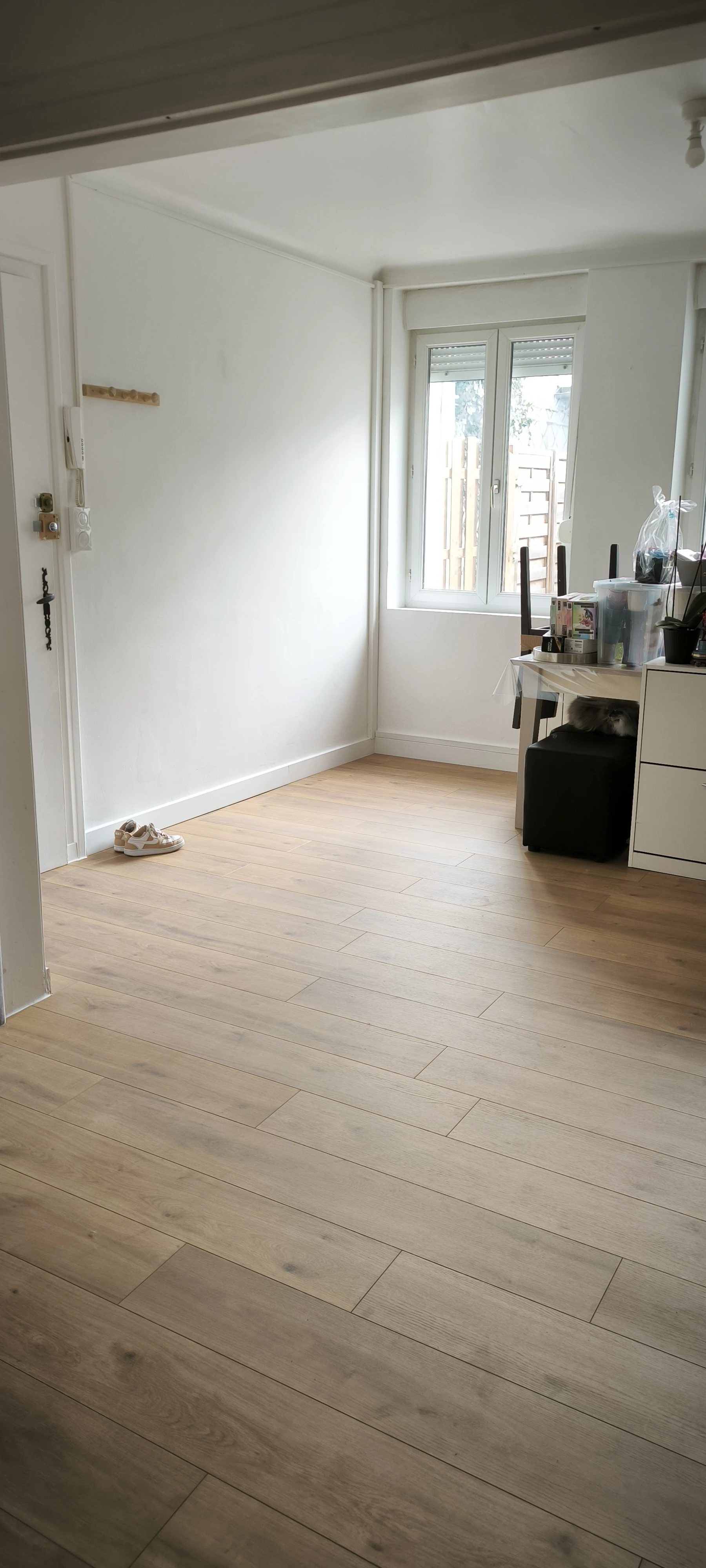 Le stratifié sélectionné est plus actuel, la pose de plinthes blanches accentue cette modernité. La pièce retrouve un nouvel éclat.
